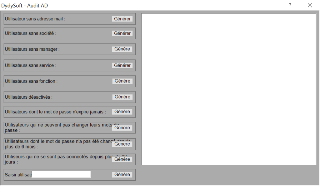 Hello, I regularly use when I audit active directories this program that I developed in powershell in order to get back to me crucial information about users. In particular users who have an expired password, without a manager, without a company etc… It looks like this :