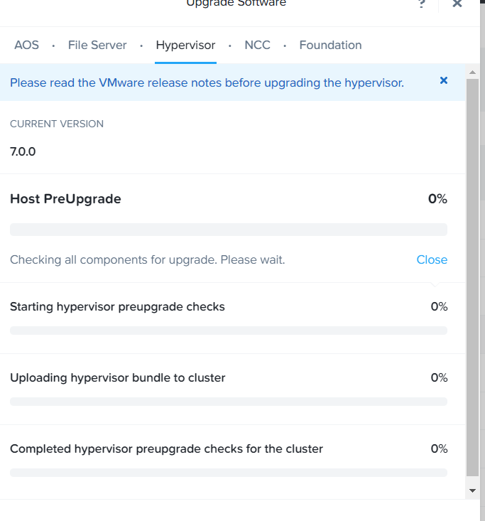 Recently, on a mission with a client for a cluster deployment. I wanted to update the Esxi hypervisor version. I got the wrong Iso file. This still begins the pre-upgrade process. However the upgrade is stuck at 0% making the upgrade unavailable. I advise you to contact support if this happens to you.