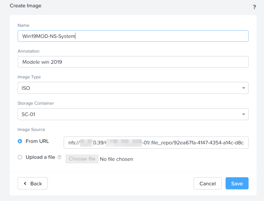 Get the nfs path and create a new image, you can take advantage of it to convert to ISO or disk. It will be necessary to add: "nfs://IP_OF_CVM/" before the nfs path. Select the destination Container.